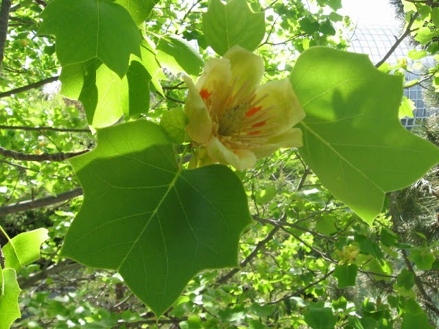 A blooming tulip tree- a tulip popular, maybe? See the shape of the leaf.
