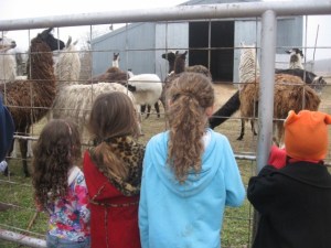 The children were thrilled with the several babies in the herd of some 30 to 40 llamas. I love the photo above of four little girls lined up at the fence watching the animals. The two children (with curly hair) are Pickard girls and two (red coat and the black coat) are Jackson sisters. The cute little girl Valerie is holding is Amy Coburn.