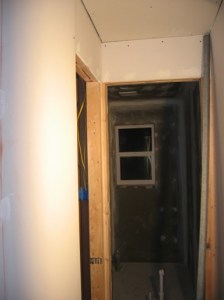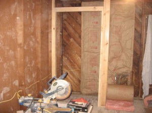 The following photos show some of our inspiring results. There will be paint and trims and switch covers, of course. A mirror will fit over the sink in the new bathroom and a claw foot tub installed. A hall was added so that the bathroom does not open into the livingroom or a bedroom (much nicer plan.)