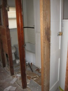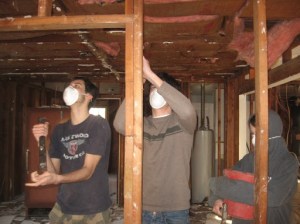 This project has been educational for all of us. We have been able to see just how a house is fitted together by taking the walls, ceilings, insulation, old wiring, existent plumbing, and some flooring out.
