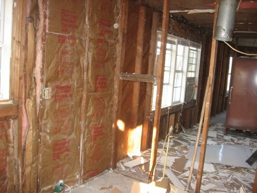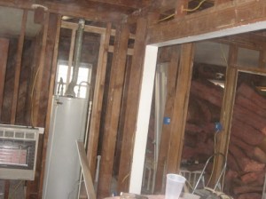This project has been educational for all of us. We have been able to see just how a house is fitted together by taking the walls, ceilings, insulation, old wiring, existent plumbing, and some flooring out.