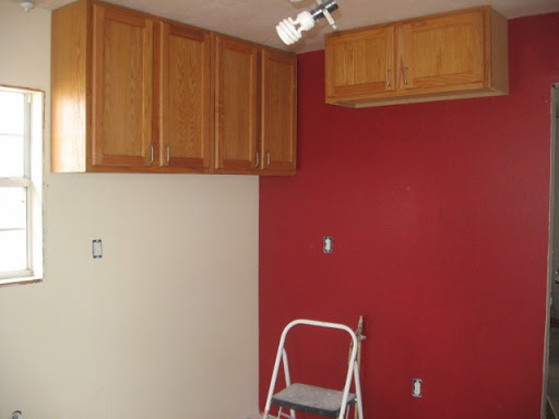 This wall in the kitchen painted red really spiced up the room. The lower cabinets and the stove will fit here.