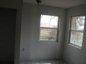 The house was owned by an elderly lady who lived in it 40 years with her cats and dogs. It was a wreck. In this picture you can see the only outside improvements so far. New windows were installed in the front bedroom that were smaller than the previous windows.