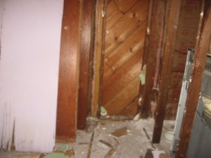 The old sheetrock walls and celings had to be torn out and hauled away. Rotten boards had to be replaced.