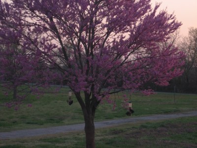 The heavy rain and hail beat the blossoms from the redbud tree which has cheered us with its pink lemonade salute to spring. Green shows now along its slender branches.