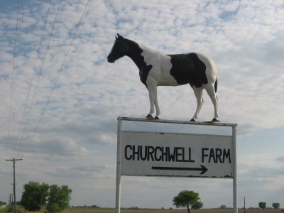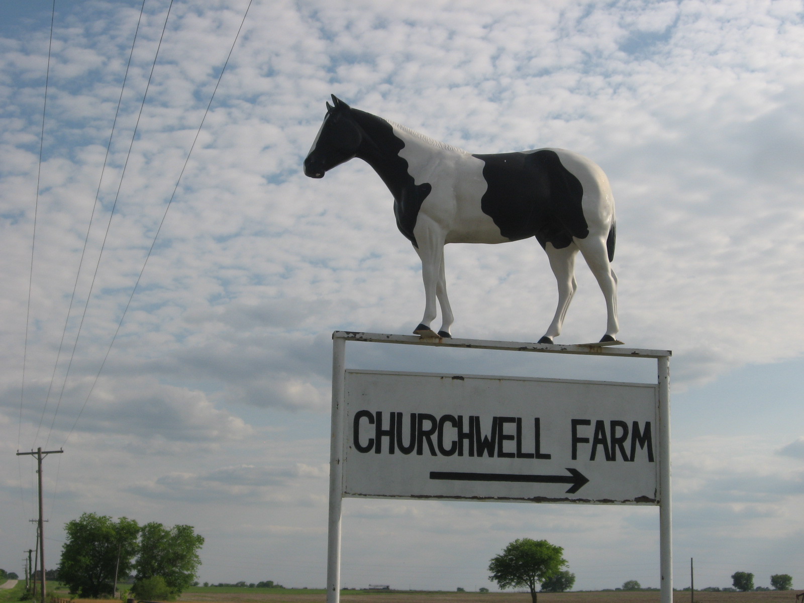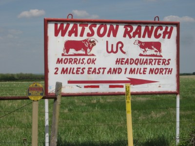 This sign points west of highway 52. Margaret loves the horse statue because it reminds her of a horse she owned and named Princess. Many of the cattle and horse ranches in my part of Oklahoma have signs like this one with animal figures adorning them.