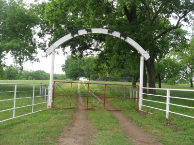This gate is quite ornamental with figures of cows decorating the arch and a red wagon wheel gate with a large “S”. Perhaps the “S” is for the owner’s last name Smith, Stevens, Stokley, or Snider. Perhaps, it is the ranch name, something like the “Big S Ranch,” or the “Swinging S Ranch.” I can only guess. This gate is one of my favorites because it looks so friendly and inviting. It is east of Okmulgee.