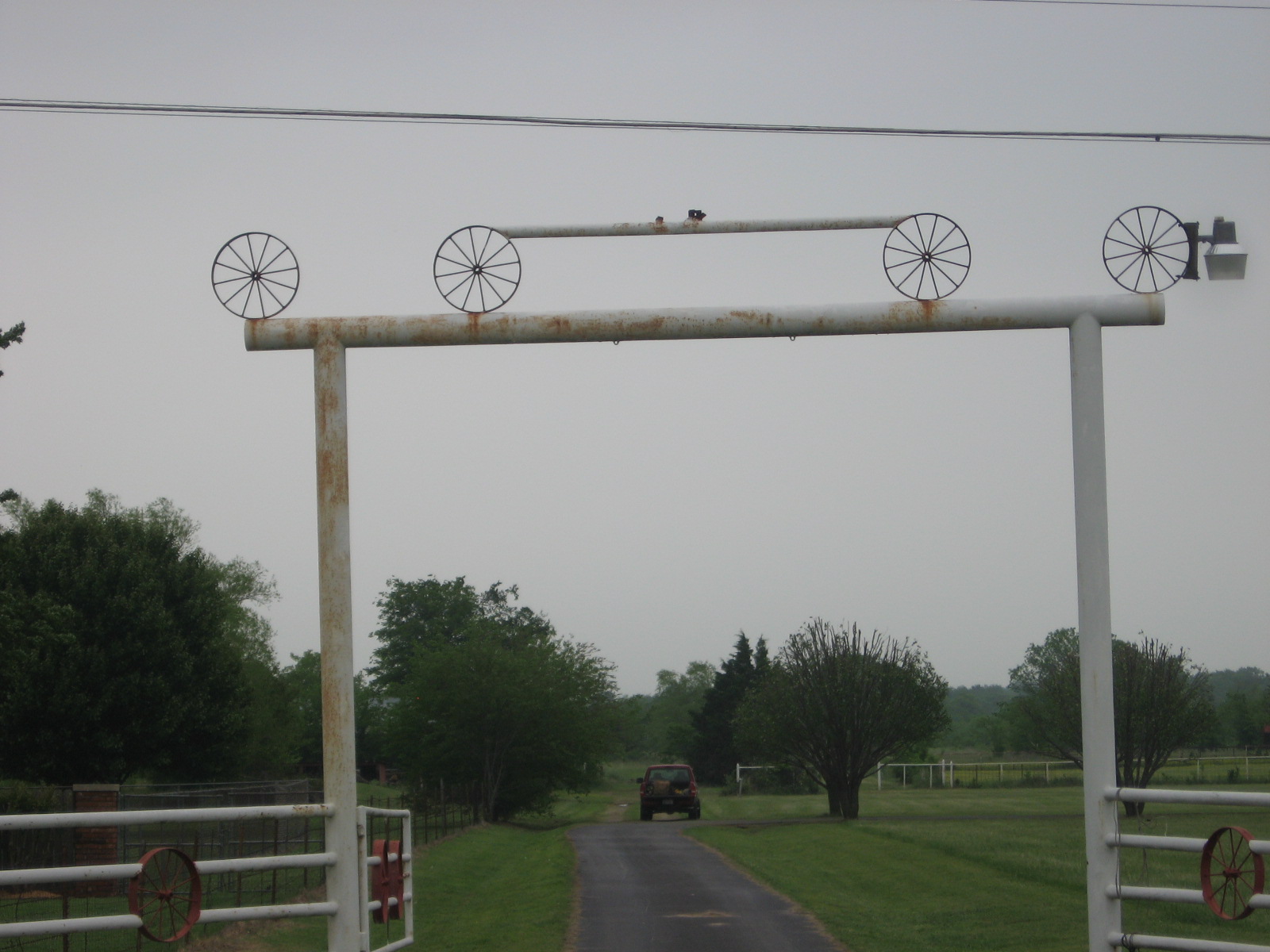 See the wagon wheel beside the gate?