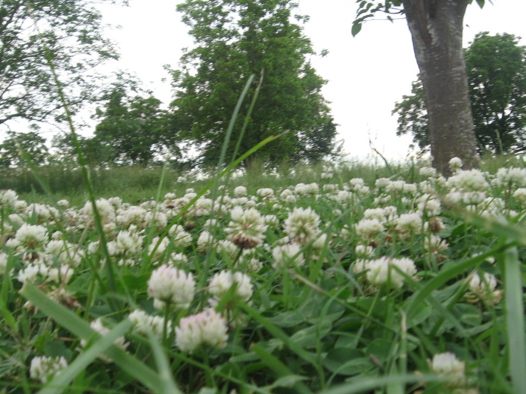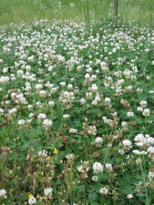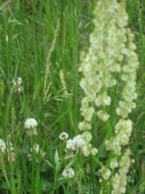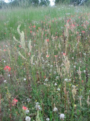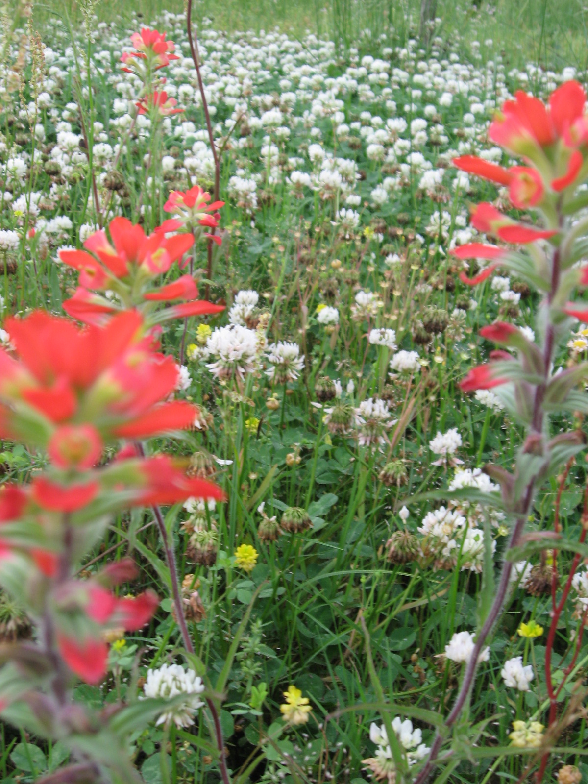 Clover with seeded grasses, ragweed, yellow hop-clover and Indian Paintbrushes.