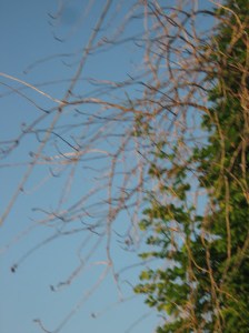 Here are old vines from last summer growing on a telephone pole. The new growth will completely cover and crush the dry sticks of last year’s vine.