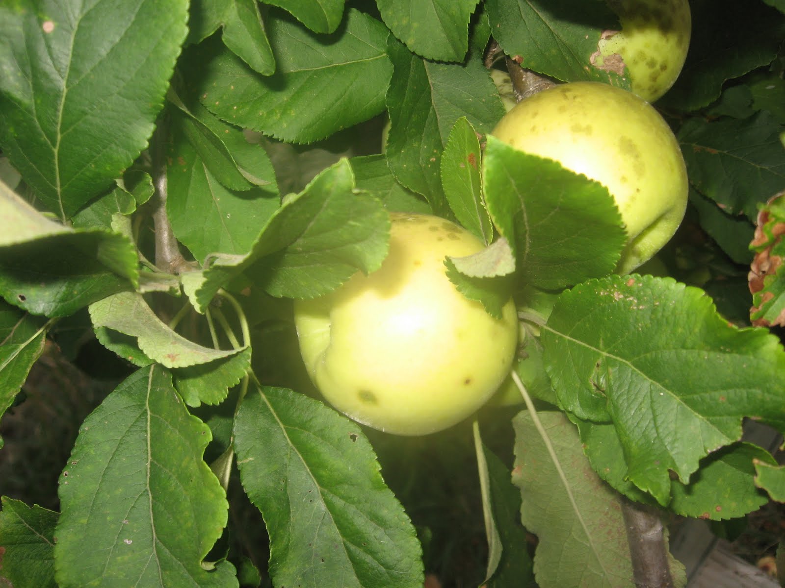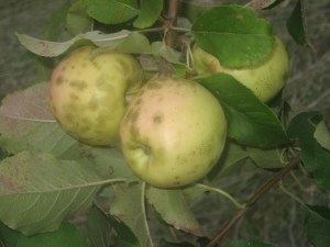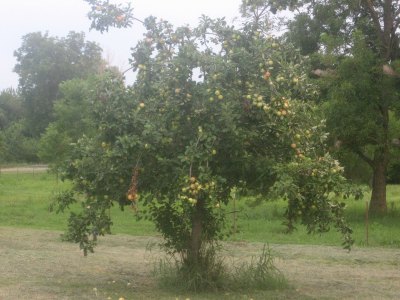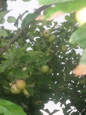 | Both of our russet trees are weighed down with too many apples. We should have thinned them in the spring. |