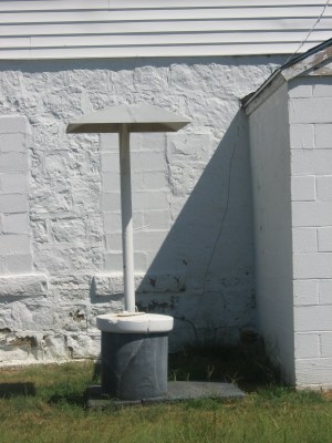 | This water well sits outside the front entrance. Hooks held the bucket ropes. |