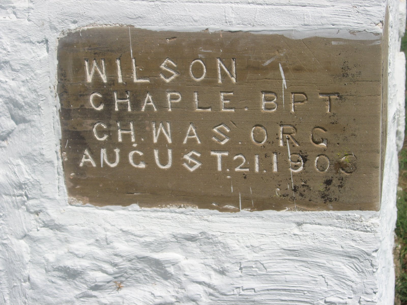 | The inscription on the buildings cornerstone says Wilson Chaple BPT CH (Baptist Church) was organized August 21, 1906. |