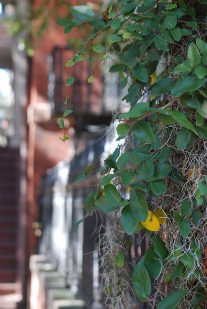 Ivy  and moss clinging to a wrought iron fence above a brick wall