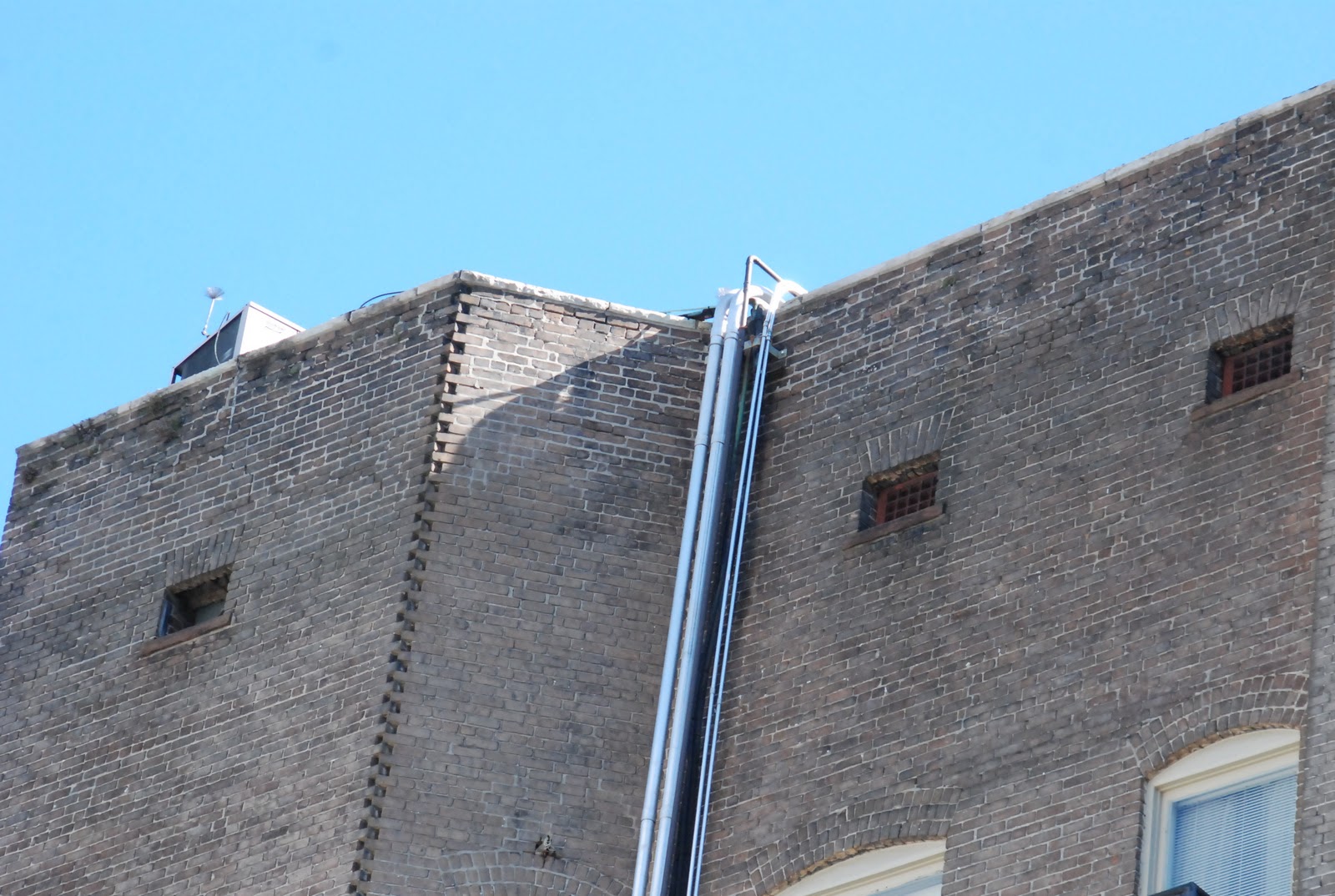 Interesting story-provoking openings at the top of some buildings seem to be open to air circulation, but are grated to keep someone or something in or out. A jail?