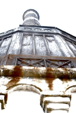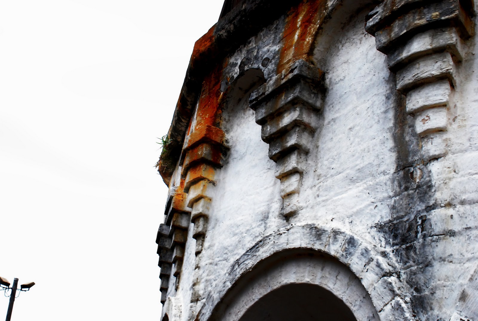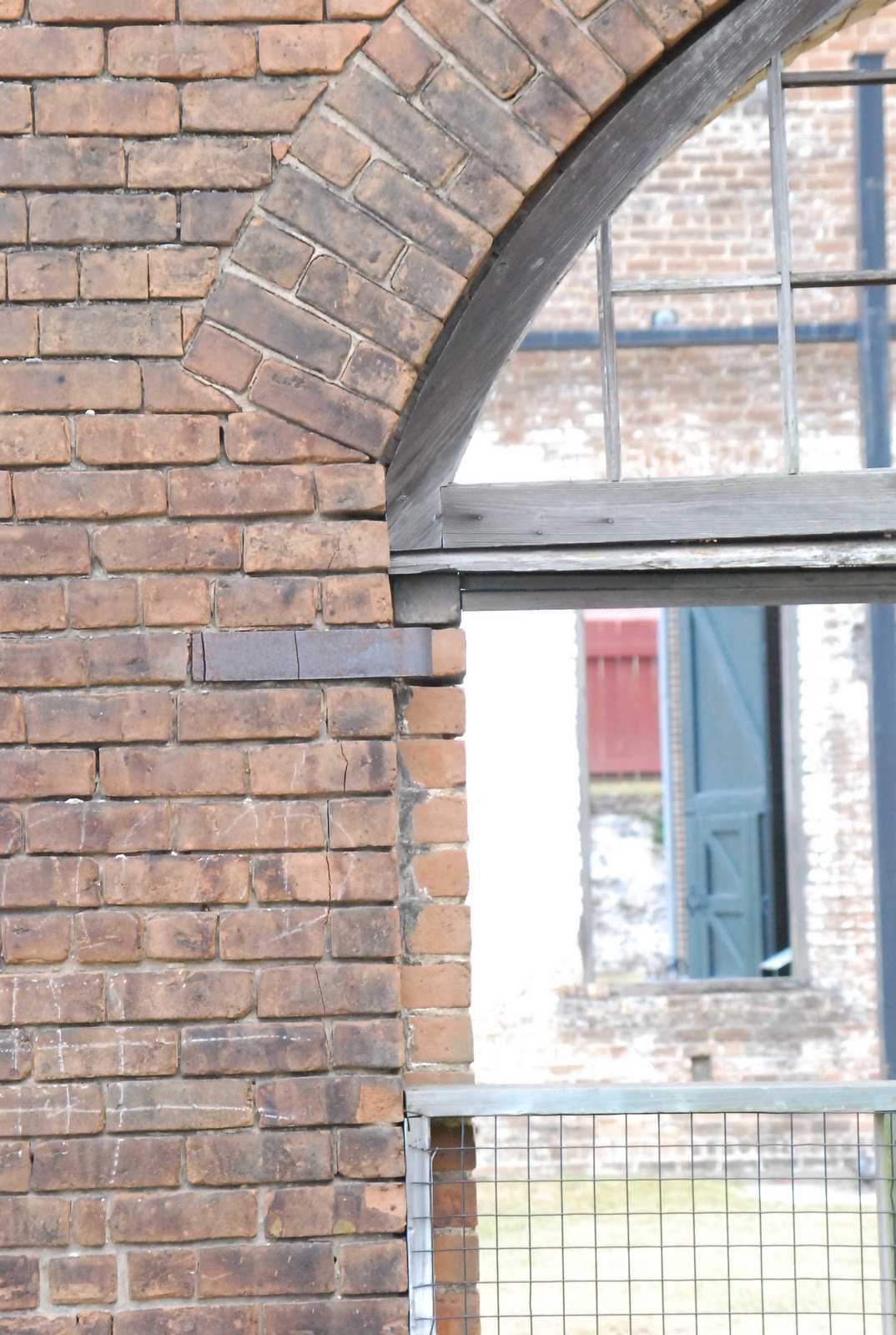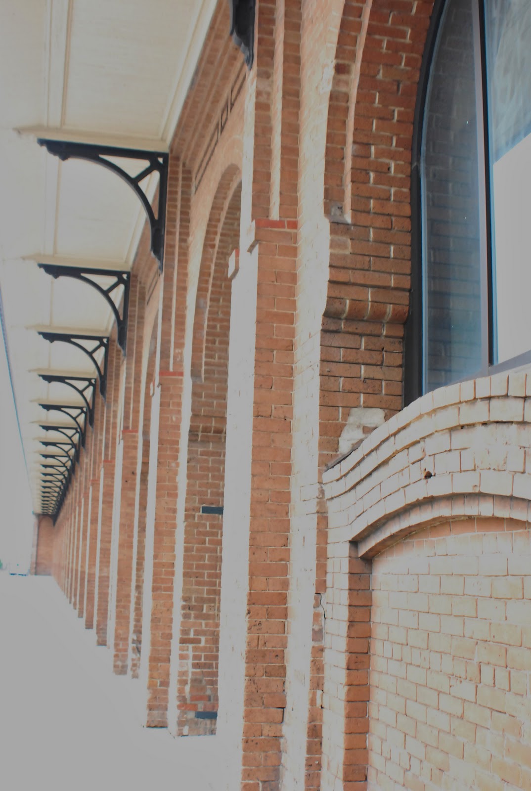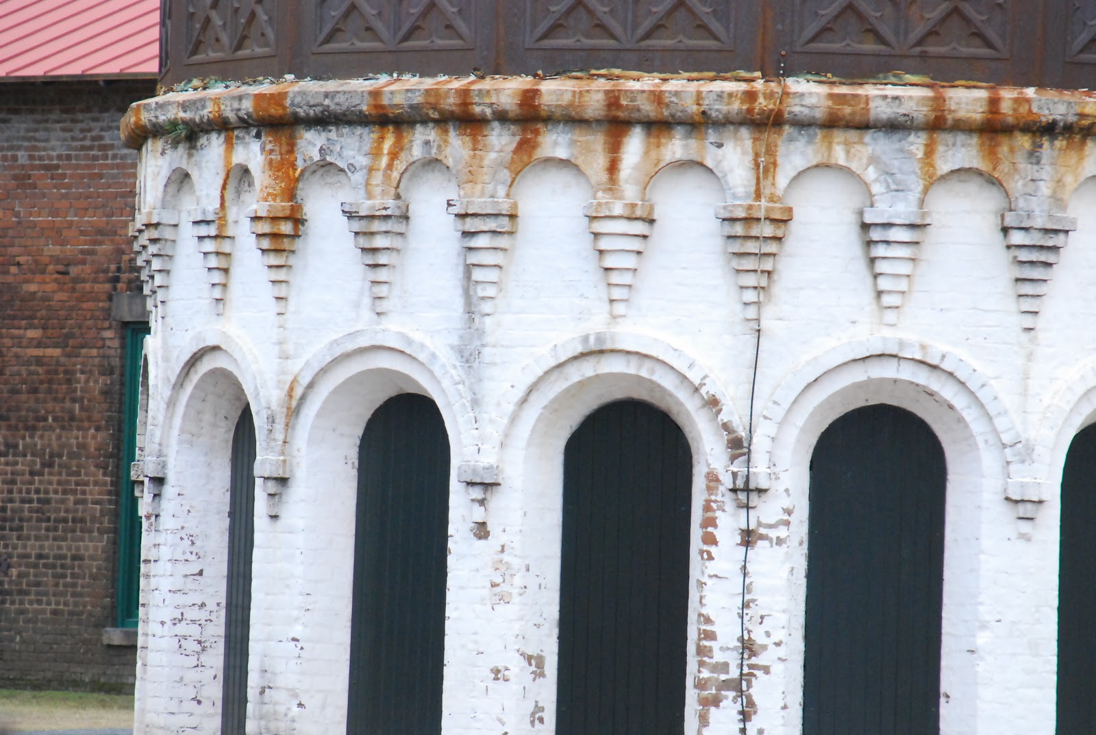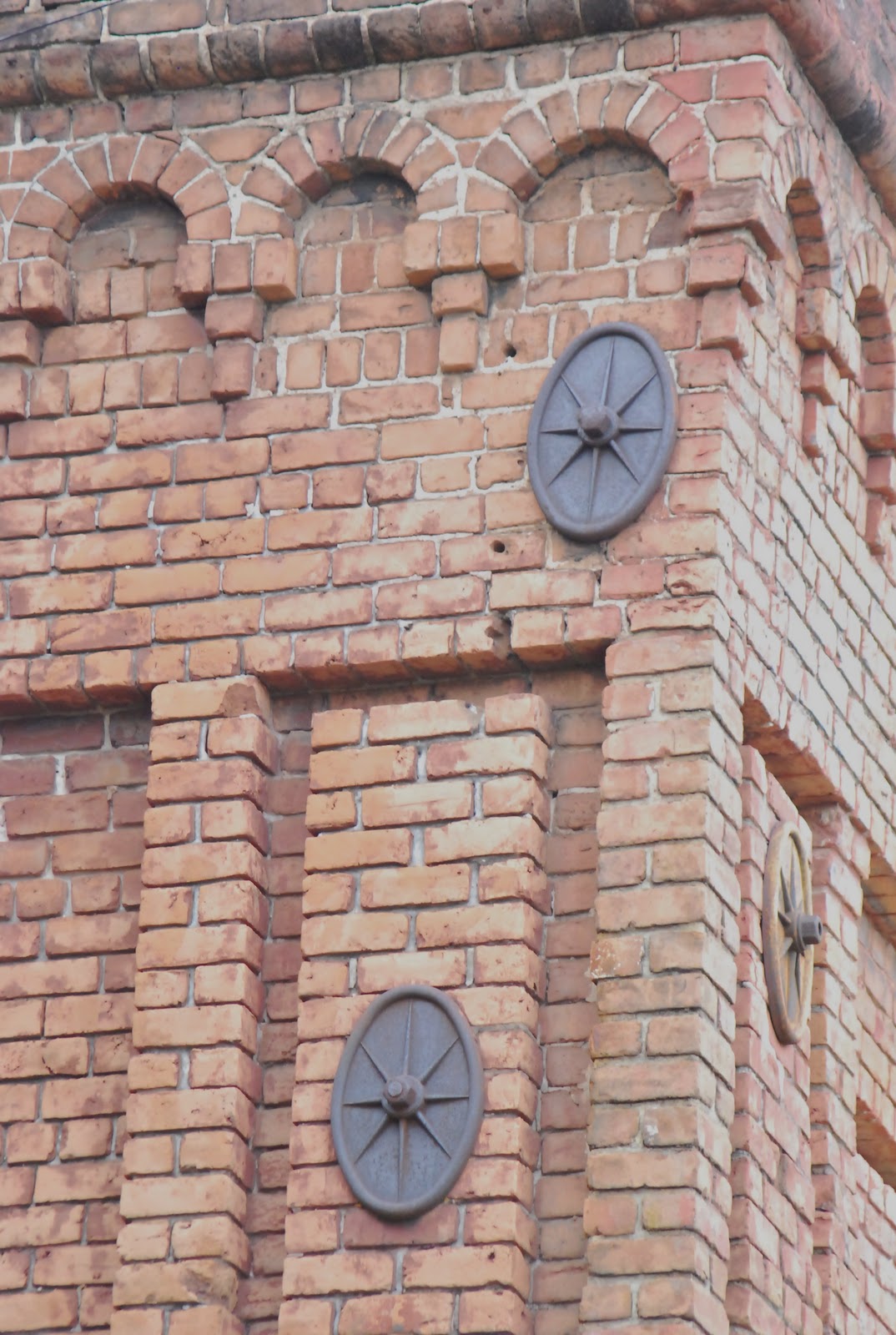 This tower building in a historic railroad station yard was three fold. From the top rose a huge chimney. The second story was a water tower. See how leaks have deposited metal rust on the white-washed brick structure which is the lower story.The doorways-18 of them encircle the lower level each at one point in the past led to a toilet. (early public restrooms)