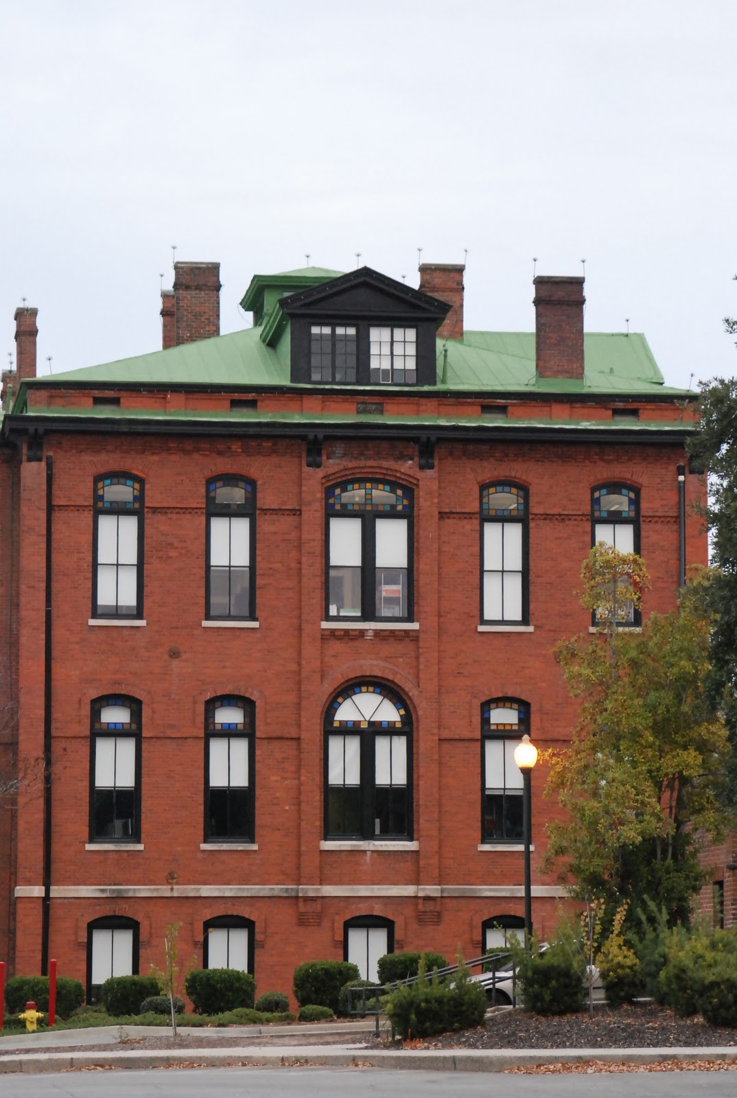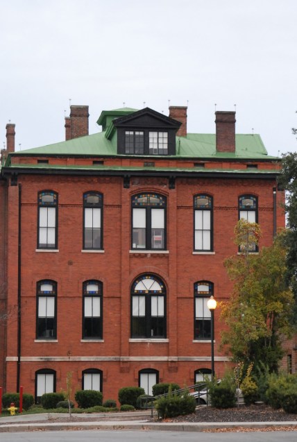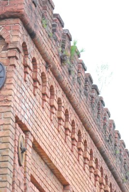 This building was restored and will house a railroad museum. It looks like a small castle except for the vines sprouting from the roofline.