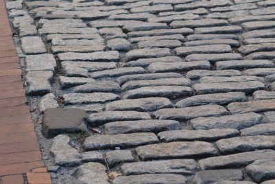 The brick sidewalk lined the cobblestone and gray brick streets.