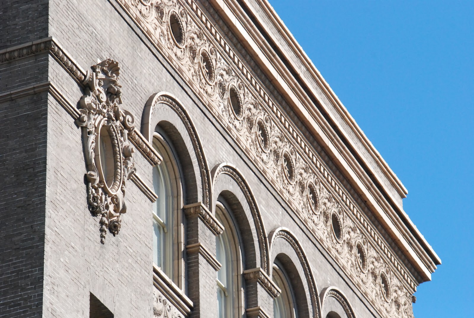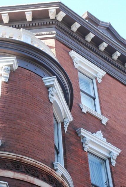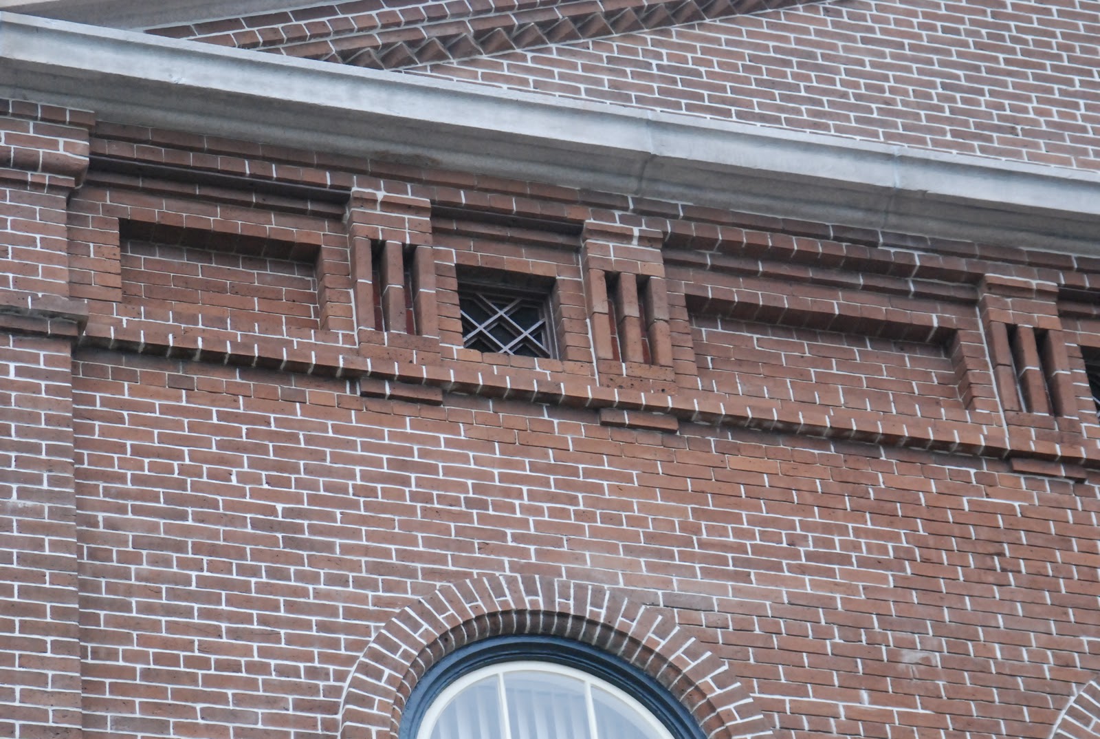 Notice the way bricks are laid around the windows of this building. Notice the pineapple-slice-shaped designs above the windows on the tower.