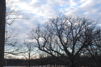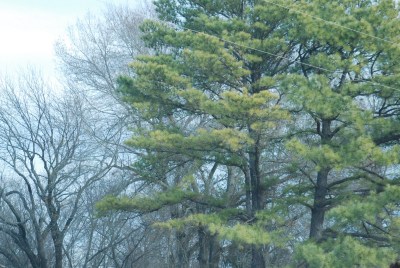 The few evergreens that grow here show up in winter when the scrub oaks are brown and the deciduous trees have lost their leaves. The branches of fir trees drop red-brown pinecones. The magnolias shiny leaves, like stacks of green plates, weigh down the limbs to the ground.