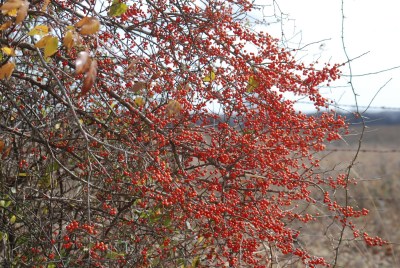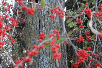 Sprays of red and green berries cling to barbed wire fences and fence posts. Tufts of mistletoe show in the bare branches that arch like filigree against the wide sky.