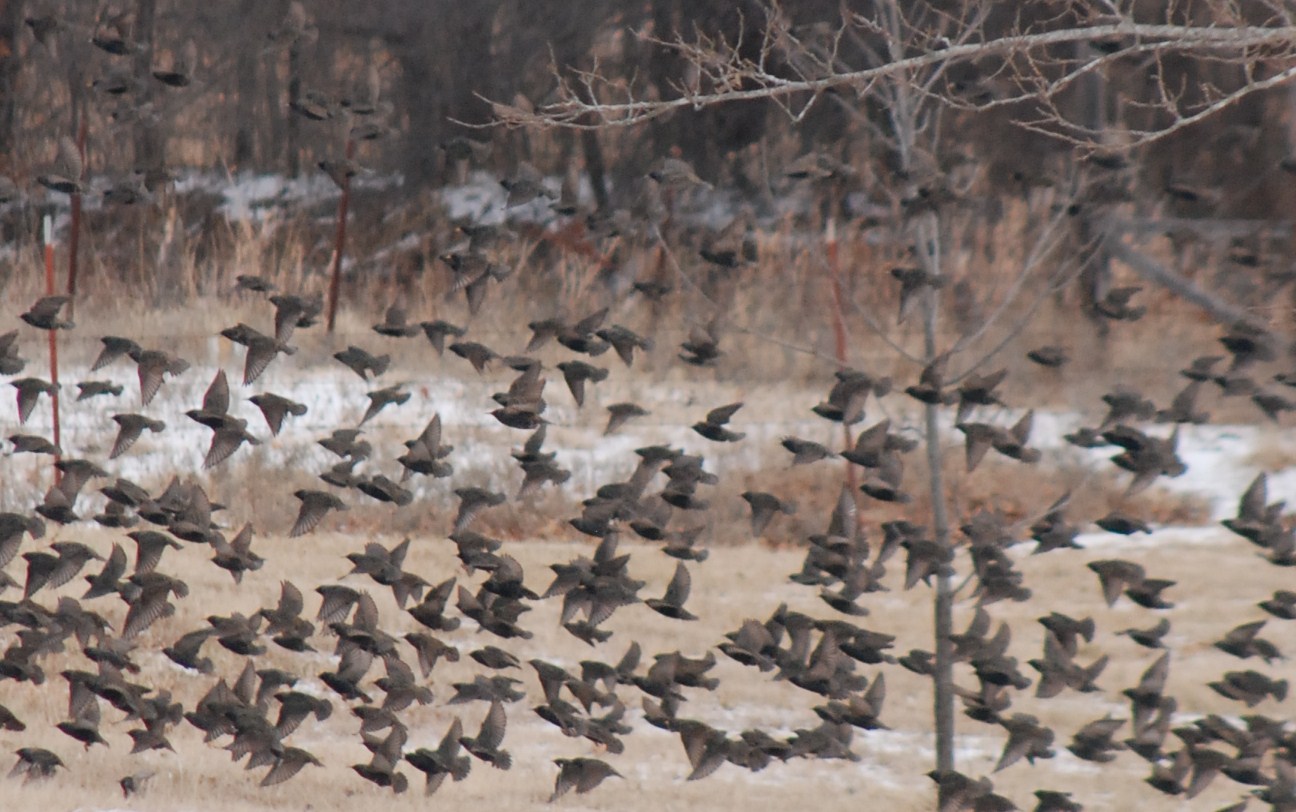 Huge flocks of brown-headed cowbirds with a few red-winged blackbirds, and Starlings thrown in cross the fields feeding in lighting moving swishing swirls like a hypnotizing dance revue finale.