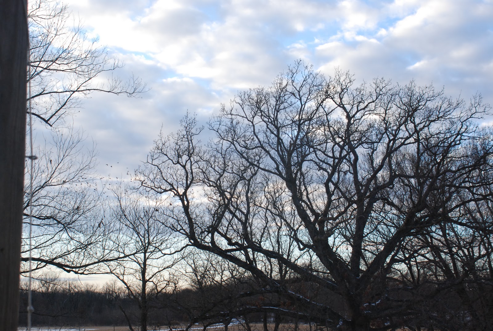 Outside my office window a fat red cardinal hops across the woodpile and cocks his head as if he is listening. Shiny black crows stalk across the dry winter grass and light in the pecan trees for a meal.