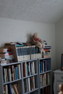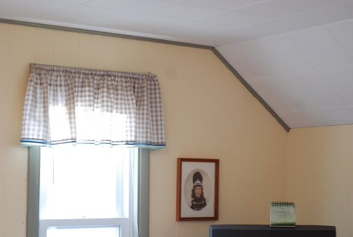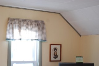 The curtains and slanted ceiling in Mama and Dad’s bedroom. Notice the photograph of Grandma Freda in her high school band uniform. She played the bass drum!