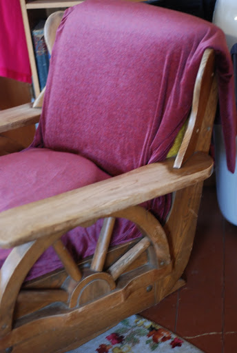 The old wagon wheel rocker that Mama loves and won’t part with. It used to be part of our livingroom set. There was a couch with cowboy style stitching on the leather back and half wagon wheels on each end to support wide wooden arm rests. The end tables and coffee table had wheels too and plank tops.
