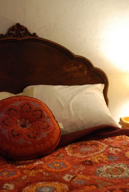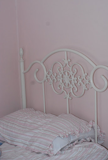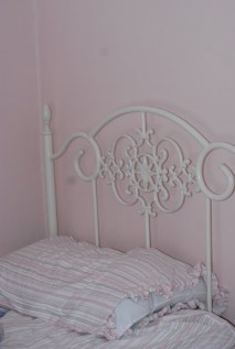The bed in Julie’s room. The walls are a soft pink and the daybed white metal. Very pretty.