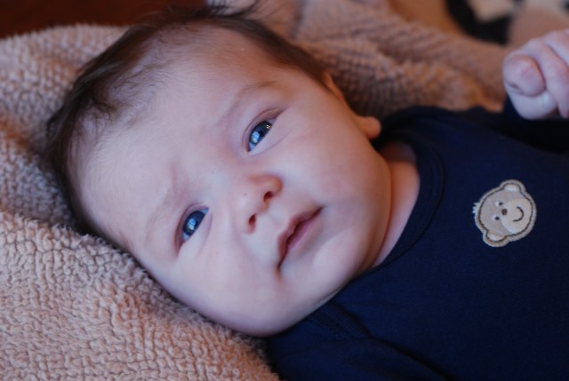 This little blue-eyed baby boy was slightly unhappy about posing for me to get my first practice at photographing an infant. He kept both fists tightly balled up like he was considering punching me. I thought he had beautiful skin and cute lips.