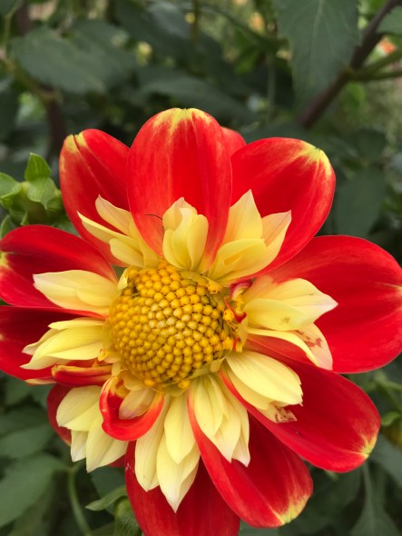 The day was cold and rainy but I could not resist pulling my camera from the car trunk and entering by the rustic gate into the community garden. Kale and other greens were thriving. These dahlias and zinnias were blooming. Peppers, gourds, and tomato plants were still producing. These dahlias drew me along a muddy path and I was amazed at their vibrant colors and unique shapes. What a cheery surprise for a cold day!