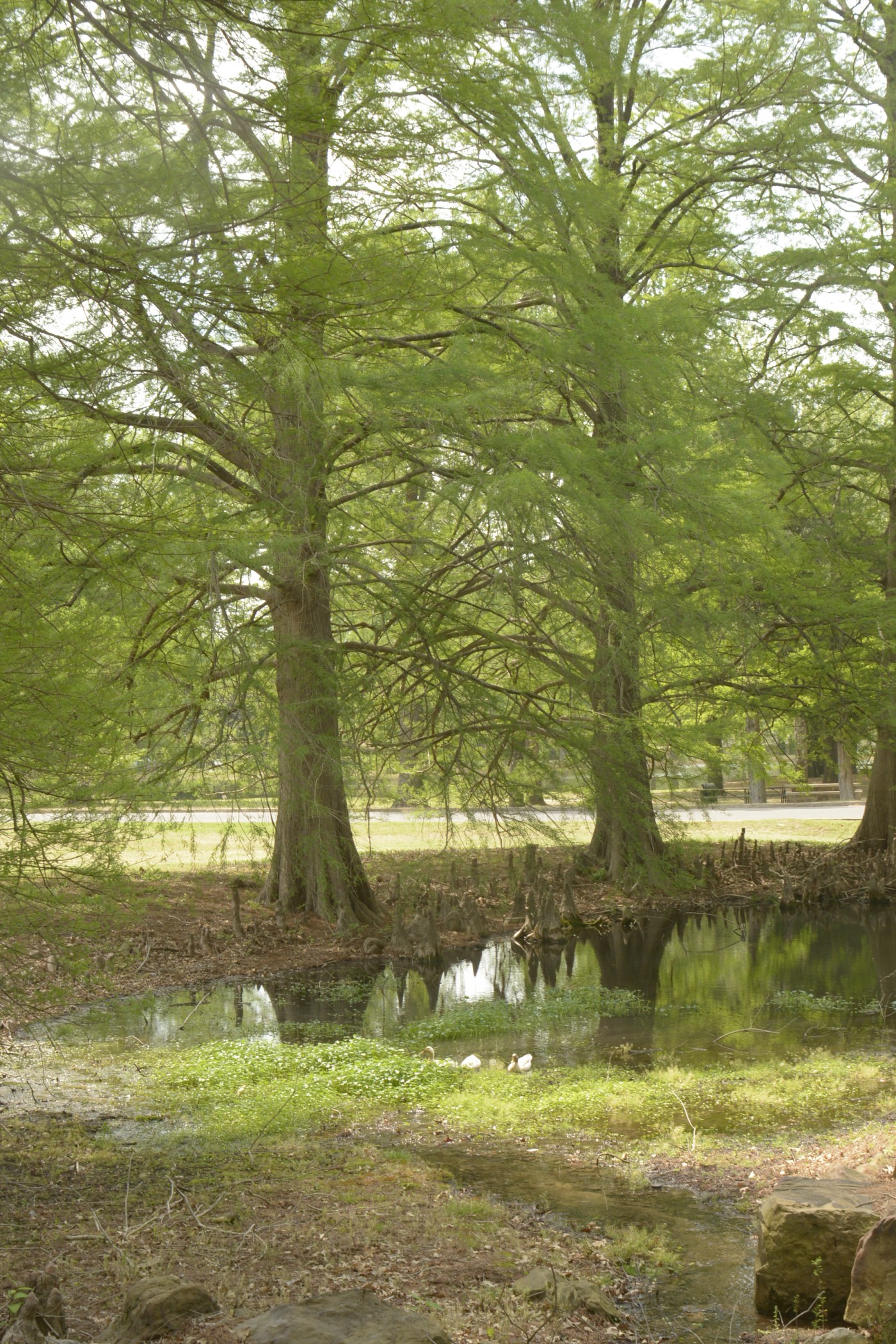 The cypress trees love the pond and grow all around its edges. They send up roots called cypress knees –roots gasping for air. Ducks glide across the glassy surface or waddle along the banks searching for bugs to eat through the grasses and around the pond, but never far. An elderly couple delight in feeding the ducks and geese from a bag of bread pieces just beside the sign that reads, “Please don’t feed our waterfowl.”