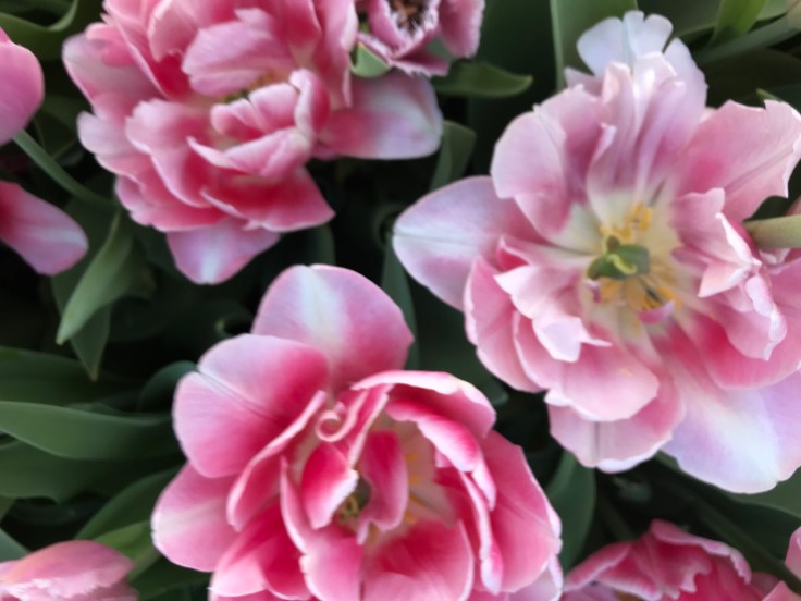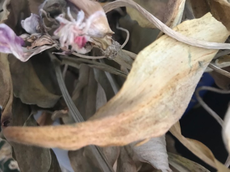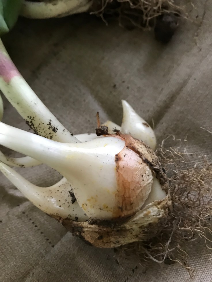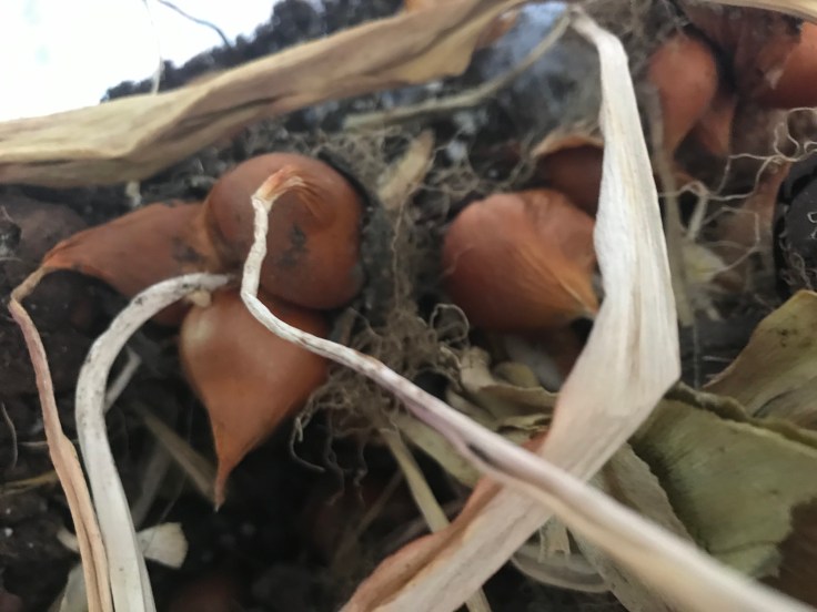 Visiting Muskogee, Oklahoma’s Honor Heights Park gardens, I found the gardeners pulling up the remains of tulips (the whole plant: leaves, bulbs, roots and all.) and laying them out separately on the concrete floor under an awning.
