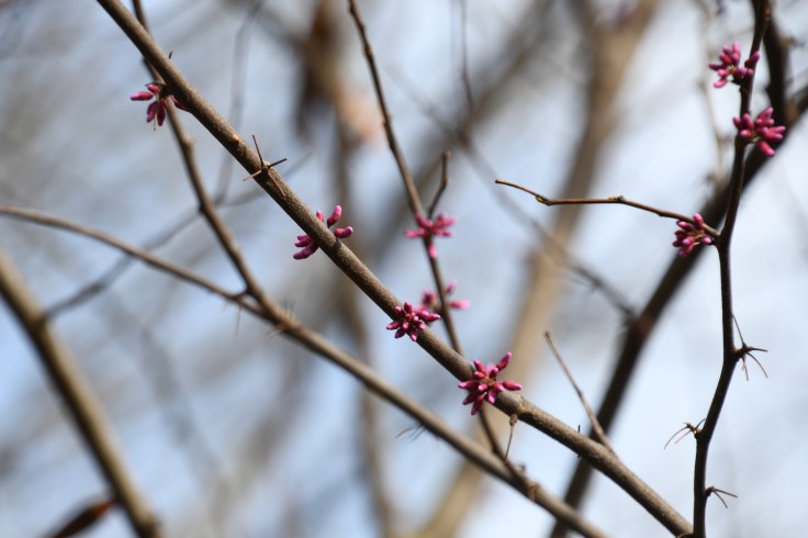 I saw on the redbud outside my bedroom window a faint glimmer. Yes, I saw a dusty shimmer almost gray, almost dusty rose—a mildest pink tinge running along the branches. Maybe I imagined it. Maybe I only thought I saw the gleam of coming spring.