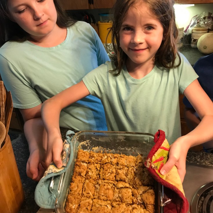 My granddaughters love to visit the farm and get in on baking in the kitchen. Here we made Grapenut bars. They are sweet and crunchy and buttery good. Some of my grandsons like cooking too but they are adept at sampling, for sure.