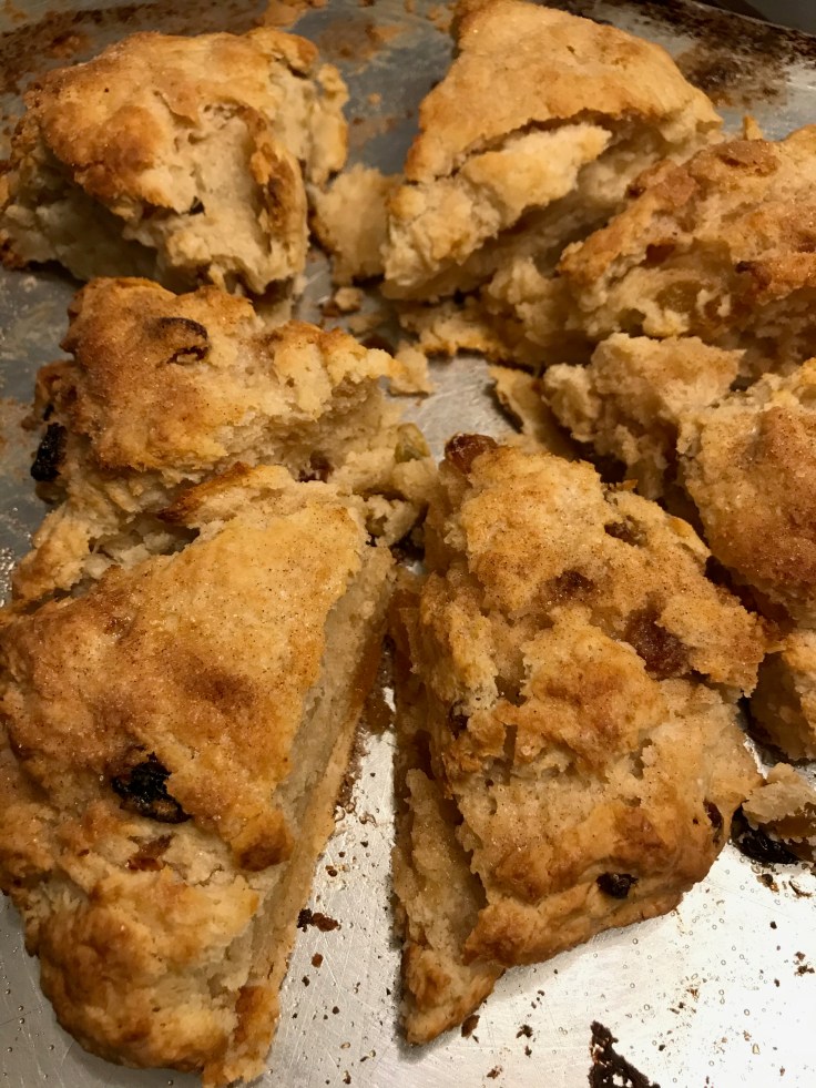 Cinnamon Scones are a quick bread and add some glamour just by their name to a tea time or a cup of coffee with friends. Here is how I make mine. Two cups of flour, 1 tsp. salt, 1 Tablespoon baking powder, 3 tablespoons sugar, 1 teaspoon cinnamon combine in a bowl. Heat oven to 425 degrees. Add 1/2 cup of raisins and /or pecans to the flour. Stir in 1 1/3 cup buttermilk. Turn the dough out onto a cookie sheet. Dust your hands with flour and shape dough into a disk. bake for fifteen minutes. Then slice the dough into pizza shapes and pull them away from each other. Melt 1/3 cup butter and pour over the pieces, Sprinkle with cinnamon sugar and return to bake another 5 minutes. Serve with sliced peaches, berries or other fruit. (And more butter!)