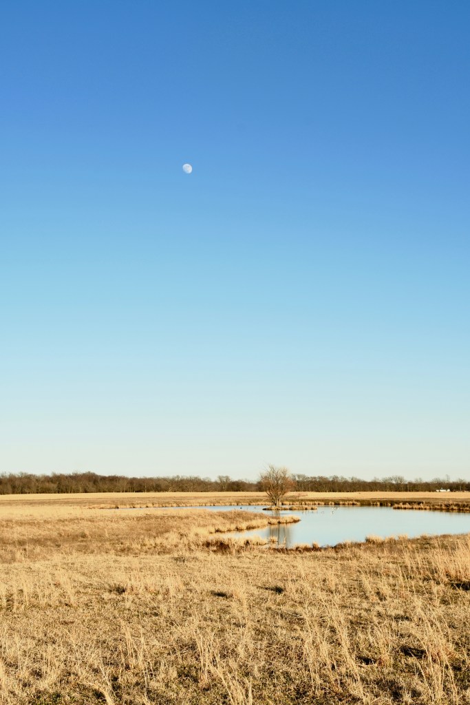 The frost was beautiful this morning after the sun came tiptoeing up over the tree line. It sparkled like a thin white tablecloth with lacy parts and a texture that you want to but mustn’t touch. The sun is up and glowing now in a clear blue sky. A few wisps of white cloud range in smooth streaks across the treetops. They rest low in the sky leaving the whole of the magnificent dome clear blue, except for a milky moon.