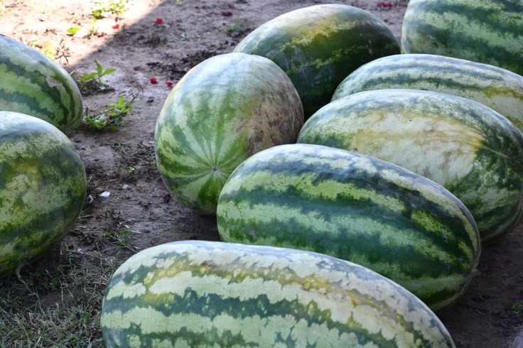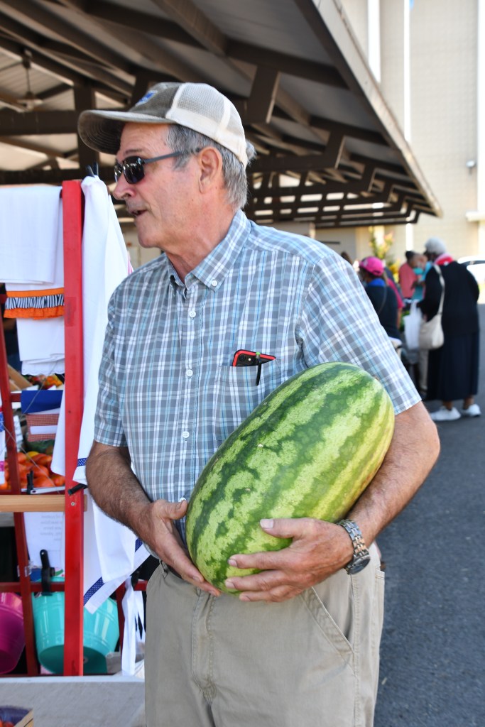 He also loves watermelon. His favorite of summer is the long stripped Jubilee. Here he is choosing one at Muskogee farmer’s market and entertaining the sellers with his choosing techniques and a watermelon jingle that goes like this: “Watermelon, watermelon––nickel or dime. Eat the meat and pickle the rind; save the seeds for planting time.”