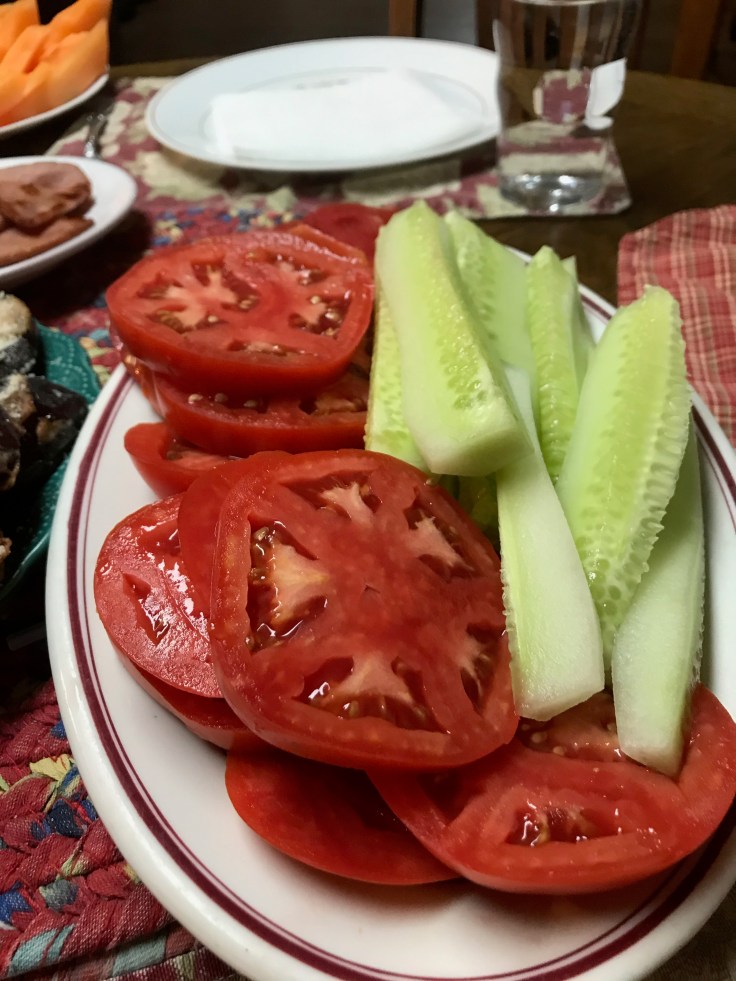 He loves tomatoes fresh from the garden and sliced unto a plate, sliced cucumbers and cantaloupe. Peaches and pears, plums and grapes too.