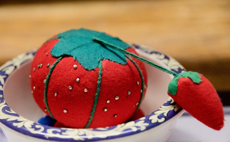 In the summer of long ago we used to spend days visiting Grandma who lived in Texas. She had a sewing basket that she pulled out for needles and threads to mend tears and to help us little girls sew doll dresses. She had a lovely little tomato shaped pin cushion and it had a green leaf on top with a green thread holding a fat strawberry filled with metal shavings which she used to sharpen her pins. I’ll bet your grandma had one too!