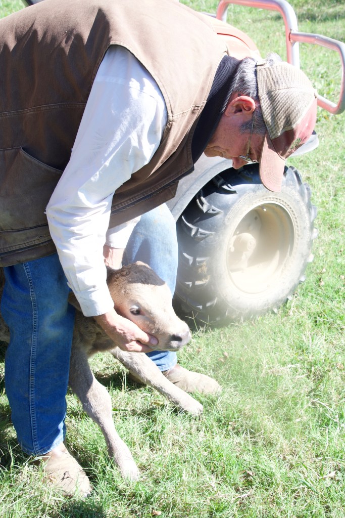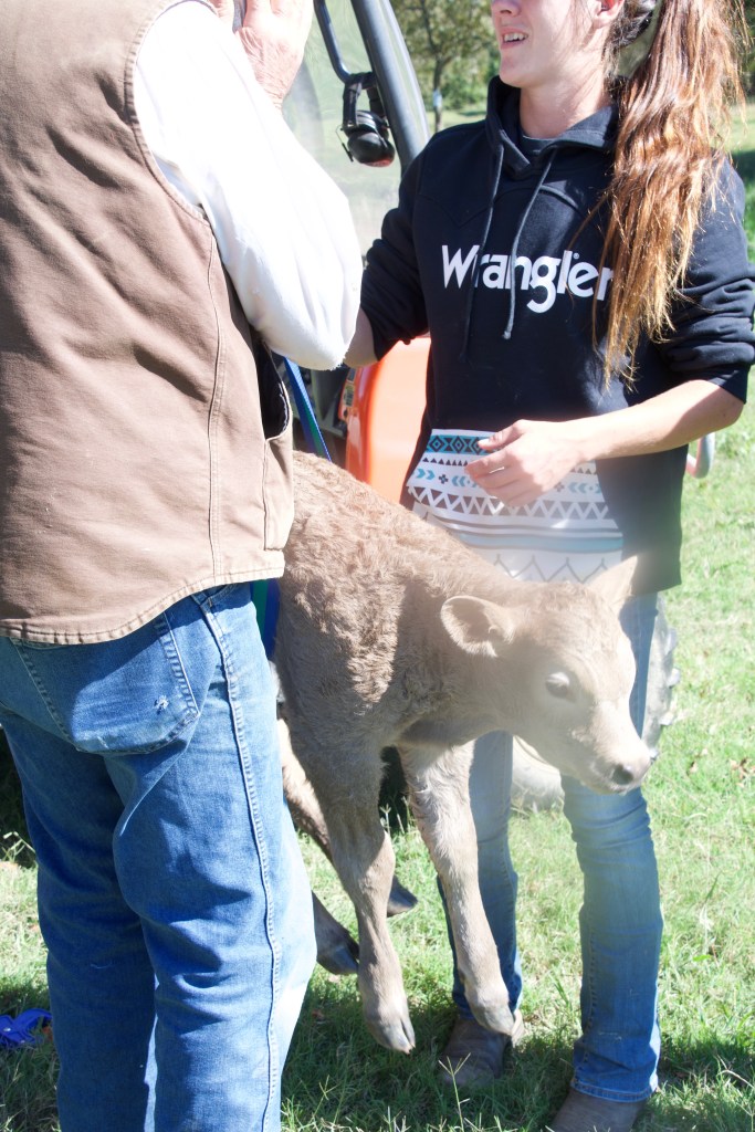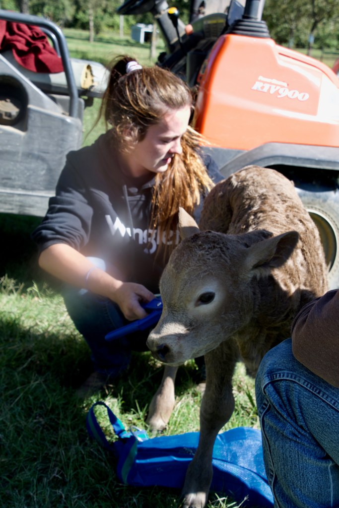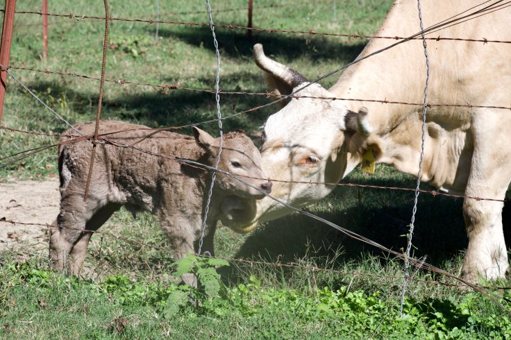 Mama Liza is very protective and doesn’t like anyone to come near her baby who had to be calf-napped by Farmer Ron and his helper Brenna to get her checked out and tended.