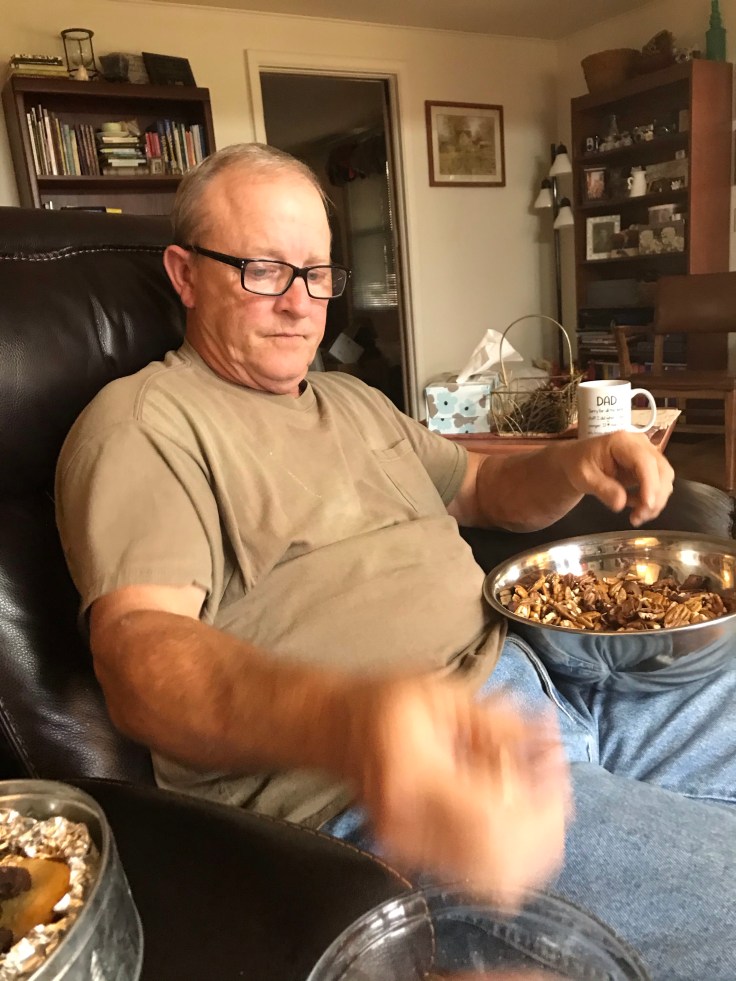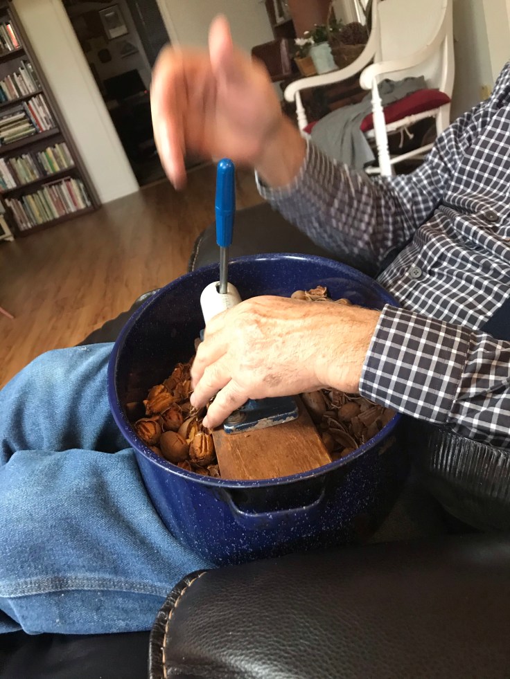 We enjoy sitting by the woodstove on cold evenings, cracking and shelling pecans, telling family stories and visiting. Ron uses an old cracker in my old blue enamel pan to crack out the nuts. Soon I haave plenty to cook whatever I want to cook and some to put in the freezer.