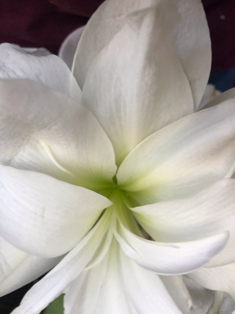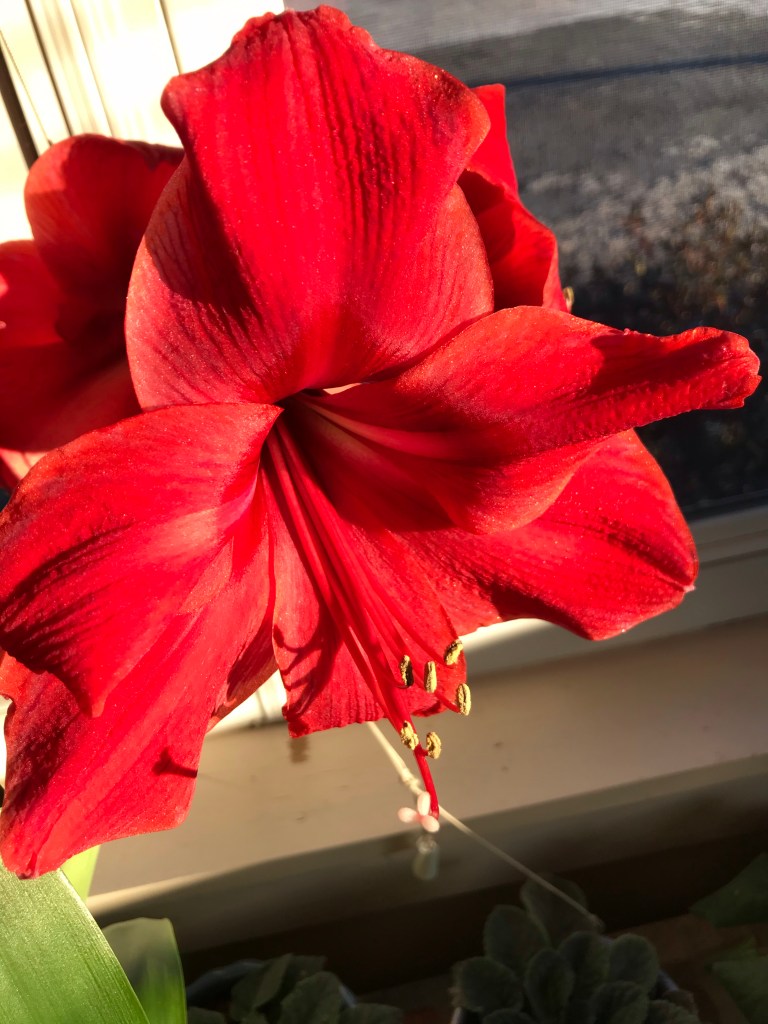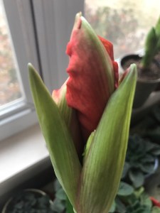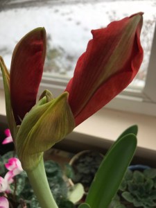 Amaryllis are a joy in the winter. They come as bulbs in a pot with soil and a cardboard lid. Remove the lid and water. Set the pot in a sunny place. Water a little each day and watch the leaves and stem grow, the bud form and swell, burst and open four lovely and amazing blooms.