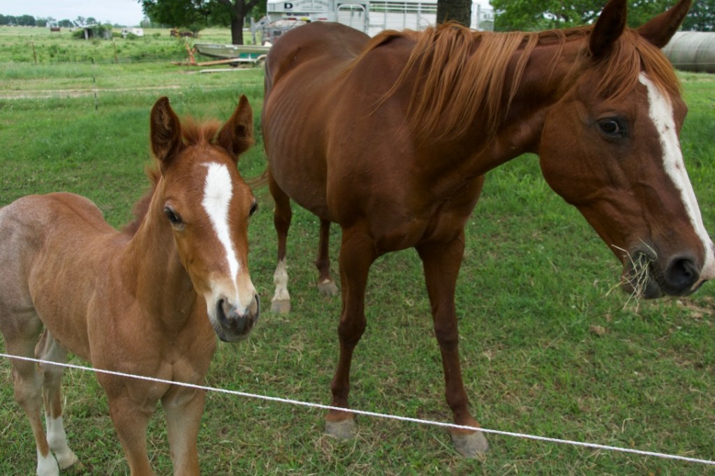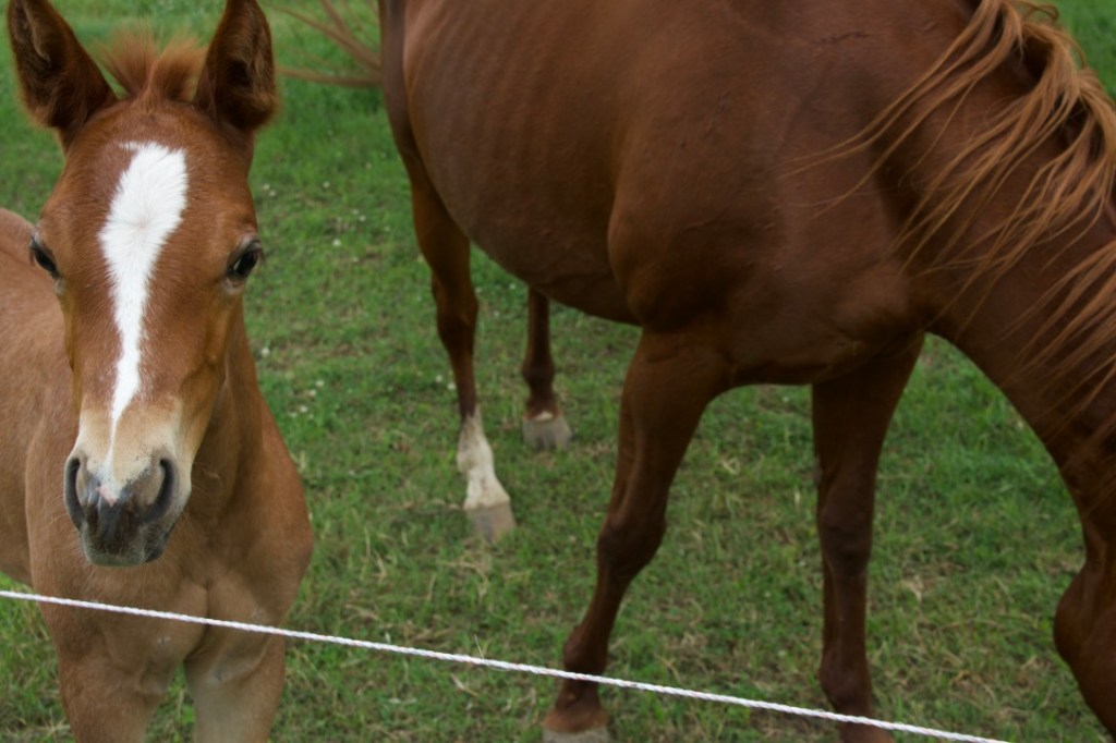 Mama grazes the fresh spring grass. She is sleek and a beautiful red/ brown. She trains her foal for the pasture life. Stay away from the electric fence. Now you eat. Now go to the trough to drink, and now trot beside me. Life is fun!