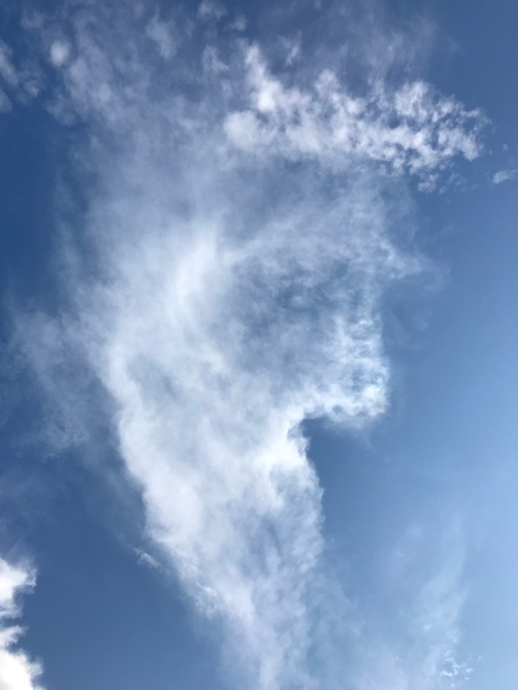 The cold air sweeping overhead sends clouds scudding and spreading across the sky. The wind builds towers of cloud and shapes and molds them. Sometimes the shapes look like something and we laugh and note it. We look for shapes in the clouds because we want messages and imagine that what we see means something fine. But very soon the “pictures” are gone. They say a cloud changes constantly and that shape never is seen again. What fun to watch and see something truly unique and gone in seconds.