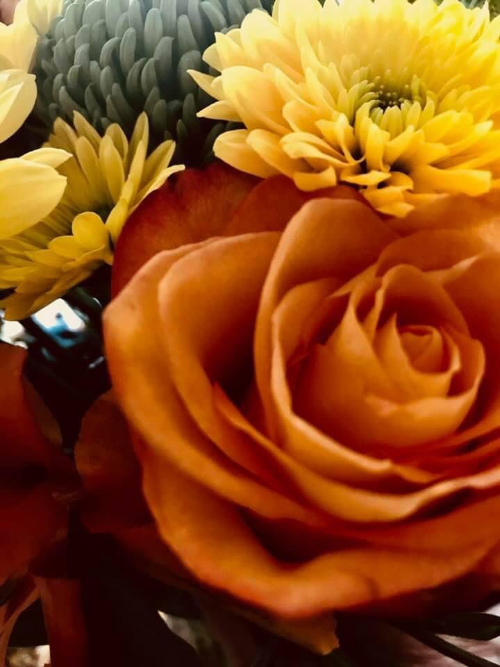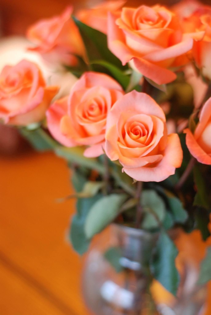 Swirls and twirls of orange and pink set among green leaves, the first summer roses strike your eye. I love the bush we have here on the farm. We bought some long stems at the flower shop. Buying fresh flowers reminds me of the farmer’s market.