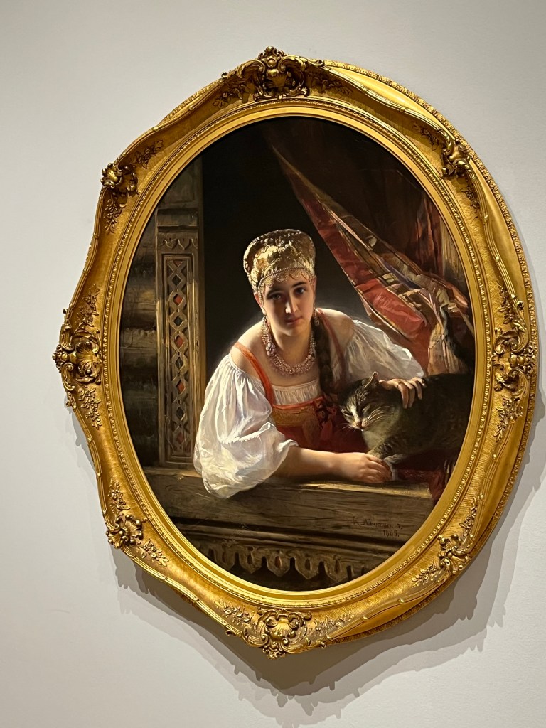 The picture frames are often as beautiful as the paintings —ornate and washed in gold. One display of modern art caught my attention using light and shadow and splashes of color to draw the eye. Many portraits like the women with the cat were perfect in detail.