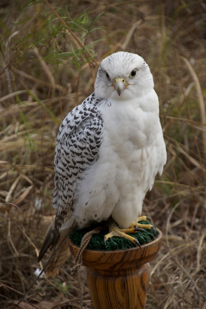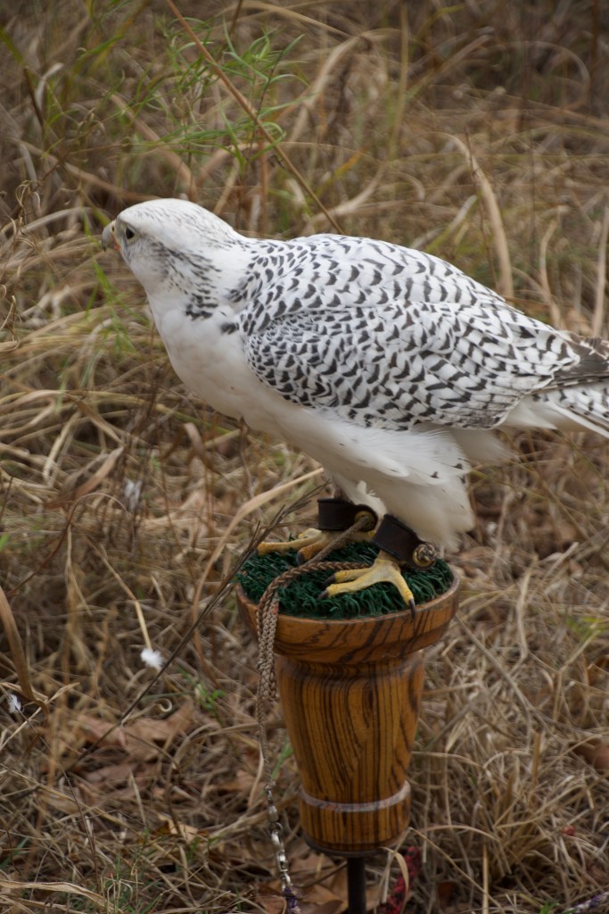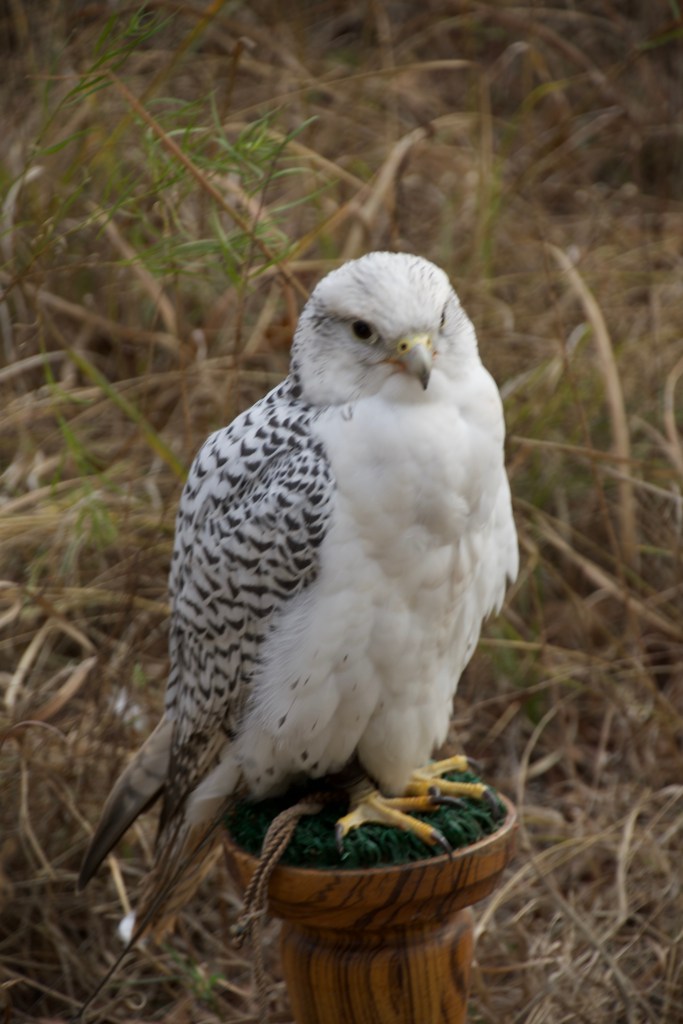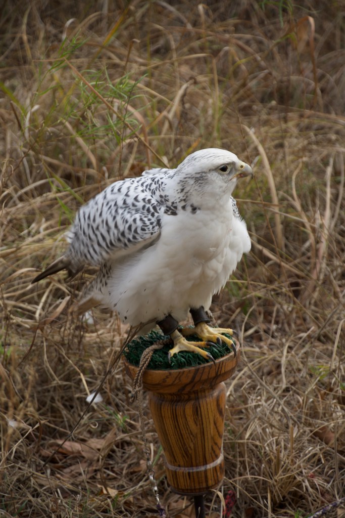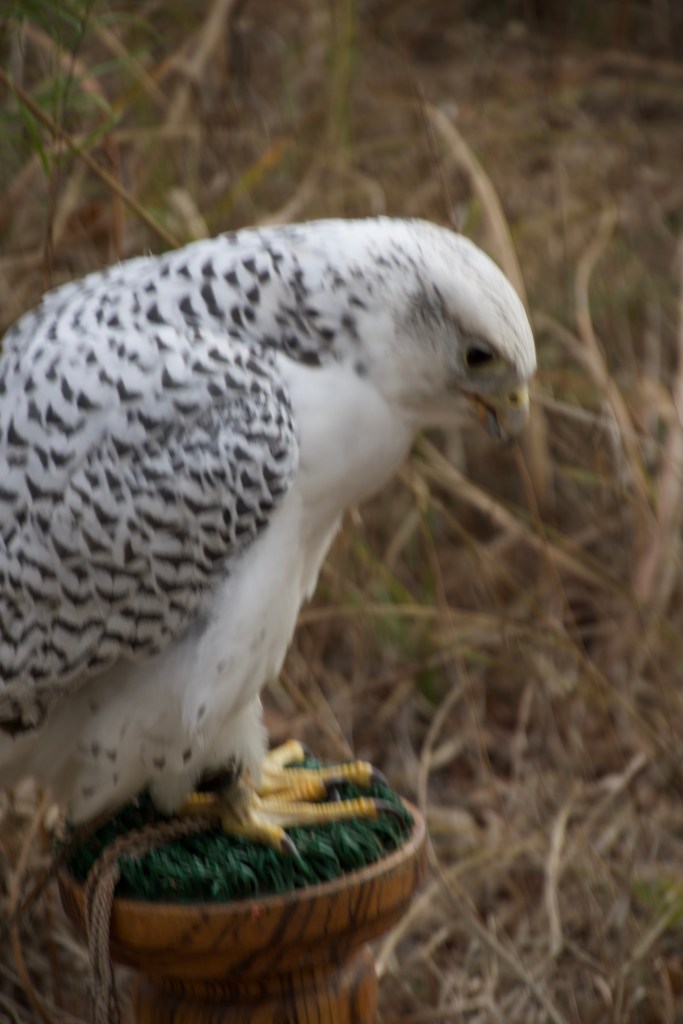 The bird was about one and a half foot tall and bright white with black speckled wings and an owl like face. He looked bright and well aware of his surroundings. The falconer had a leather wrist band for the bird to perch on and had him trained by voice commands. There seemed to be a bond of trust between the two.