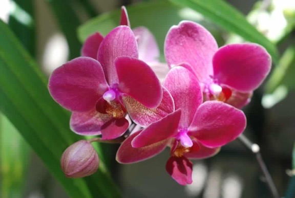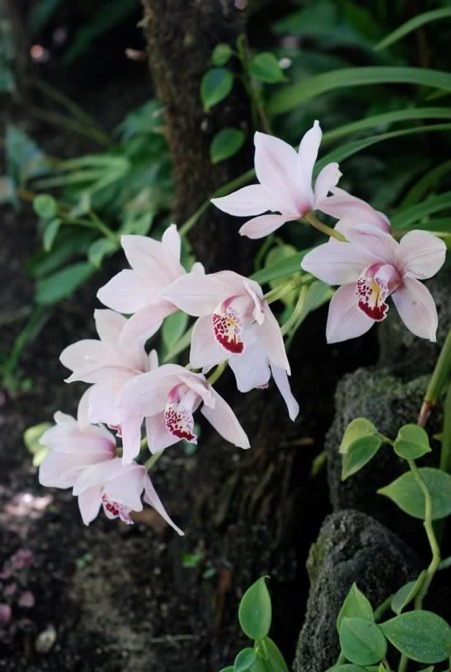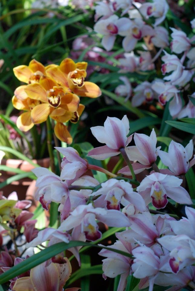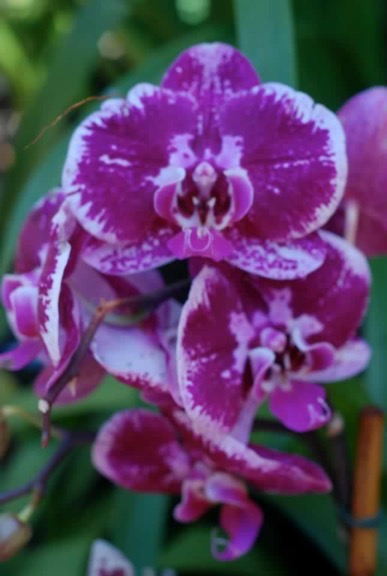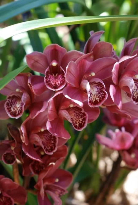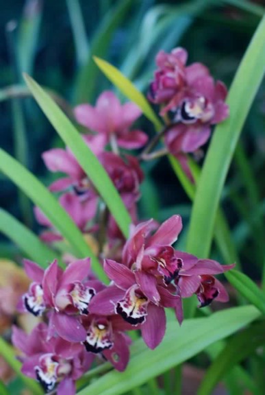 Orchids are like flower carts overflowing with fancy lady’s dresses speckled, stripped, spotted, and mottled. Green spears of leaves are their petticoats and the contrast for their bright colors. Orchids are fun. It amazes me that God created flowers for us. Such pieces of fanciful imagination. Every one a different shape and color. Each a different story, song, or poem.